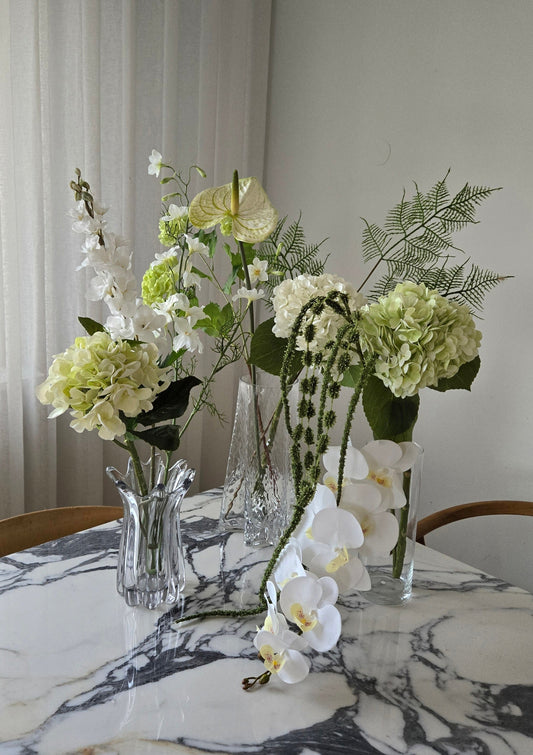 Myndirnar af blómvöndunum eru til viðmiðunar og hvet ég þig til þess að raða blómunum saman á þinn hátt. Einnig gætir þú viljað skipta stórum vöndum í nokkra minni vasa. Leyfðu hugmyndafluginu að ráða för!
