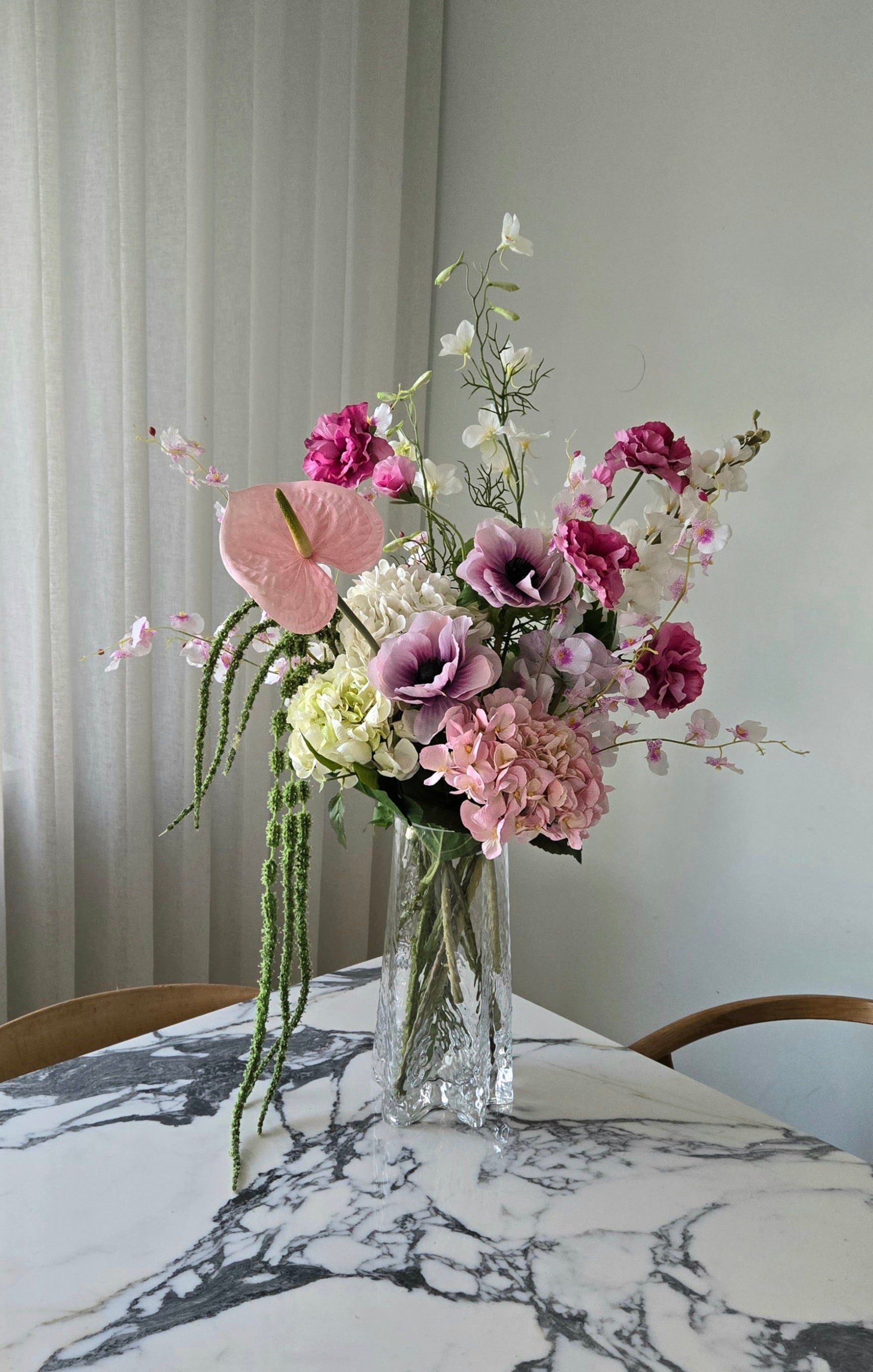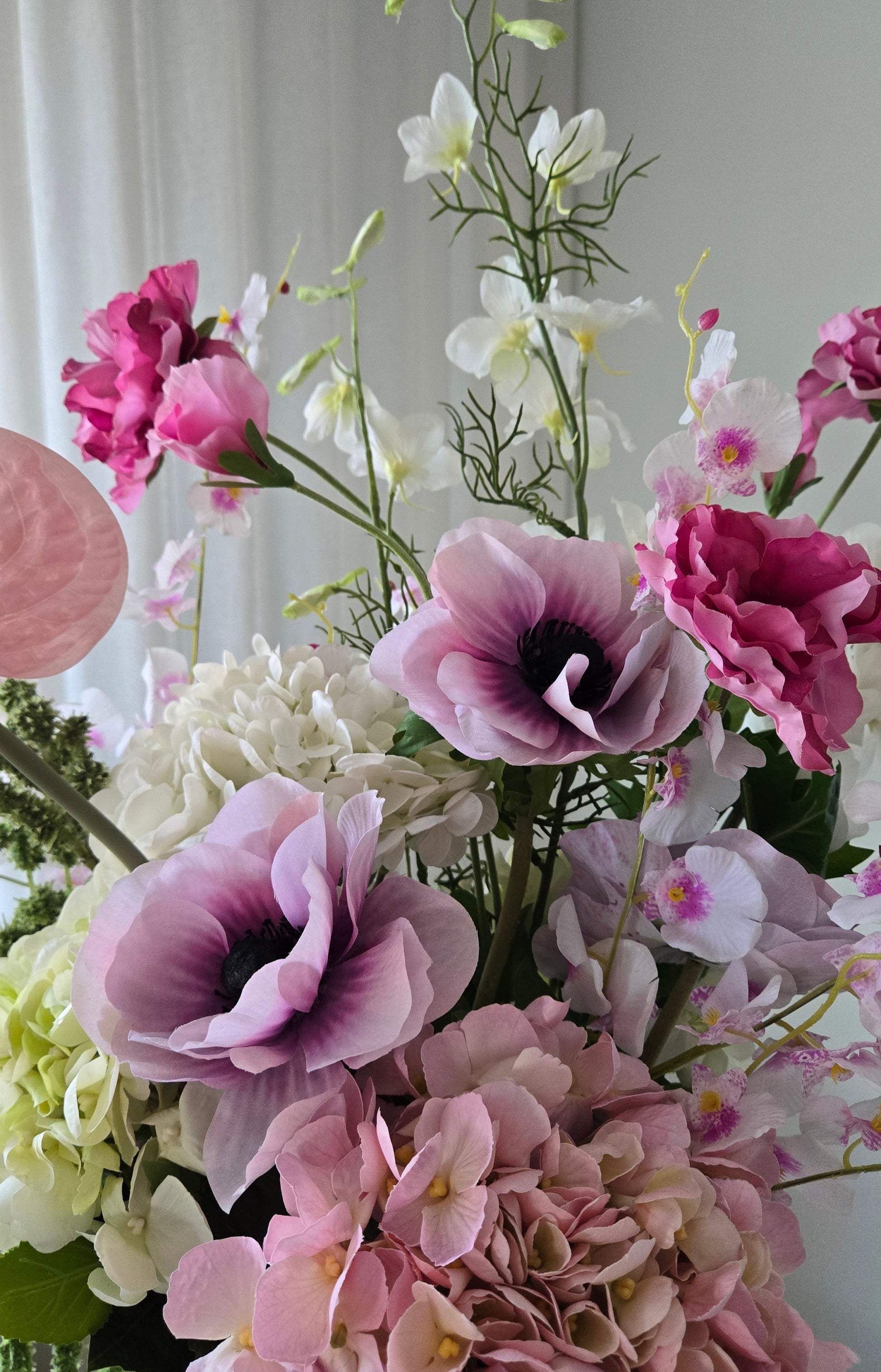 Bleikur og sætur vöndur sem inniheldur 15 stilka. 3x Hortensíur, bleikt Flamingó blóm, Cherry Blossom grein og fleiri falleg blóm.