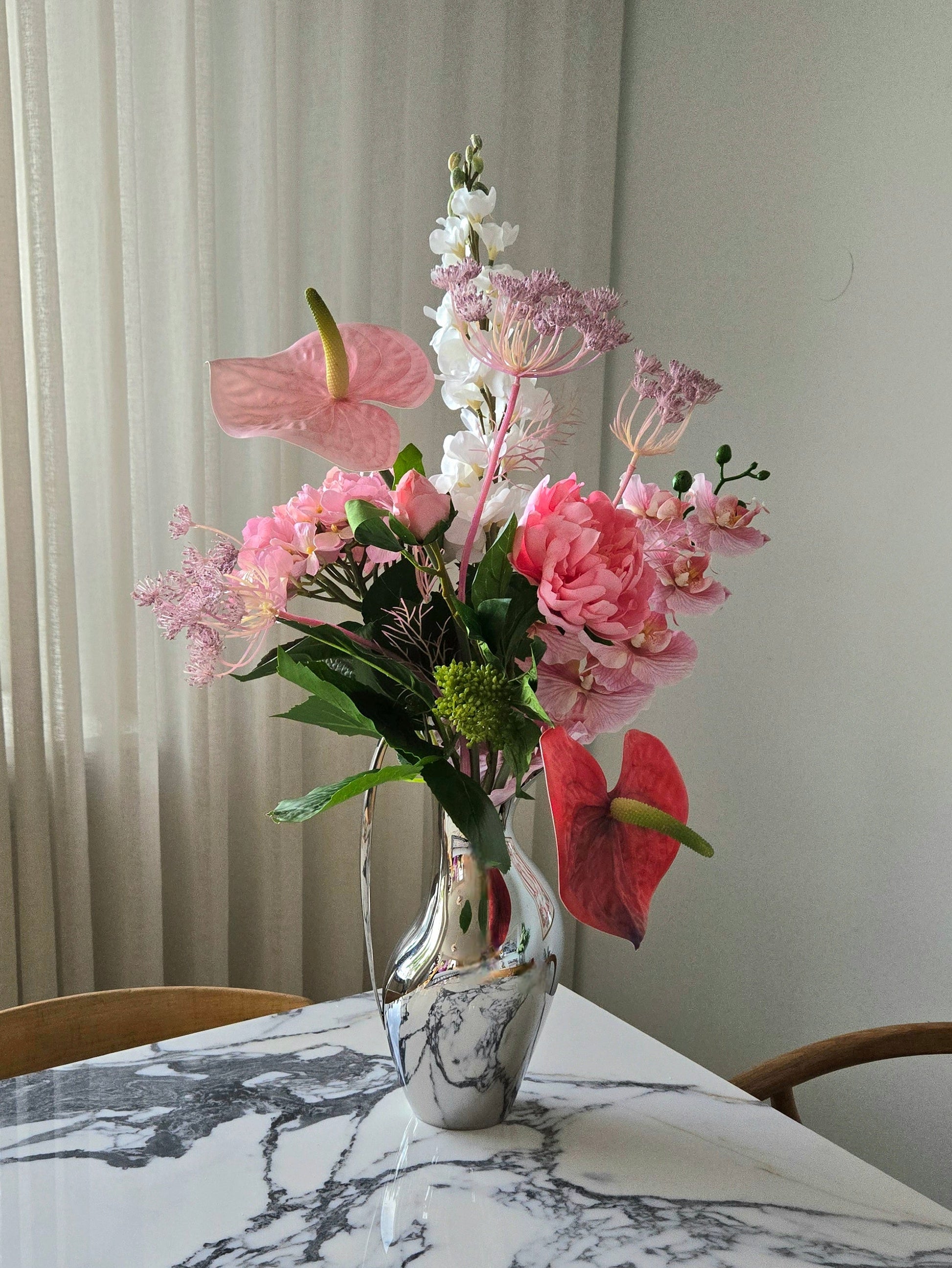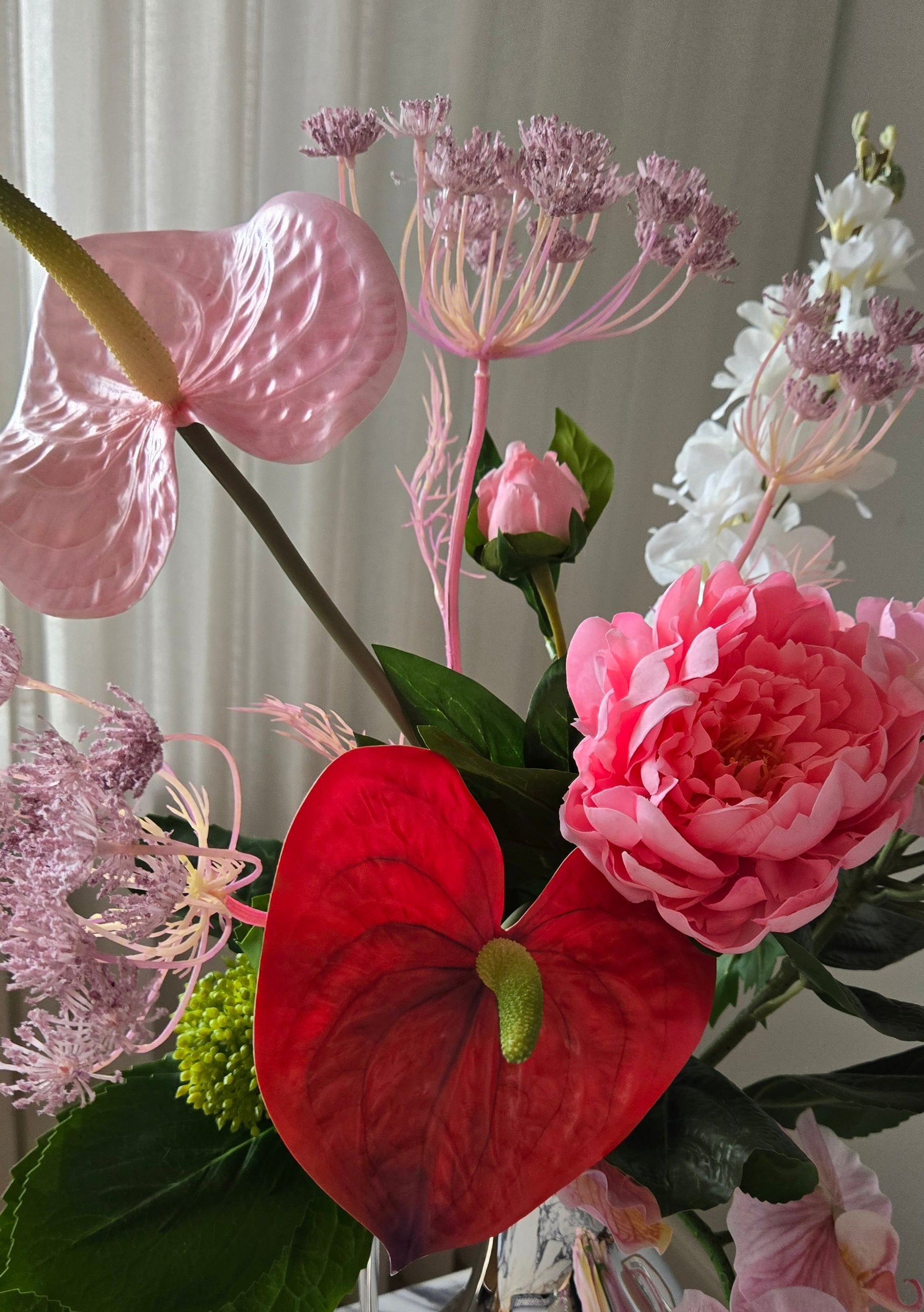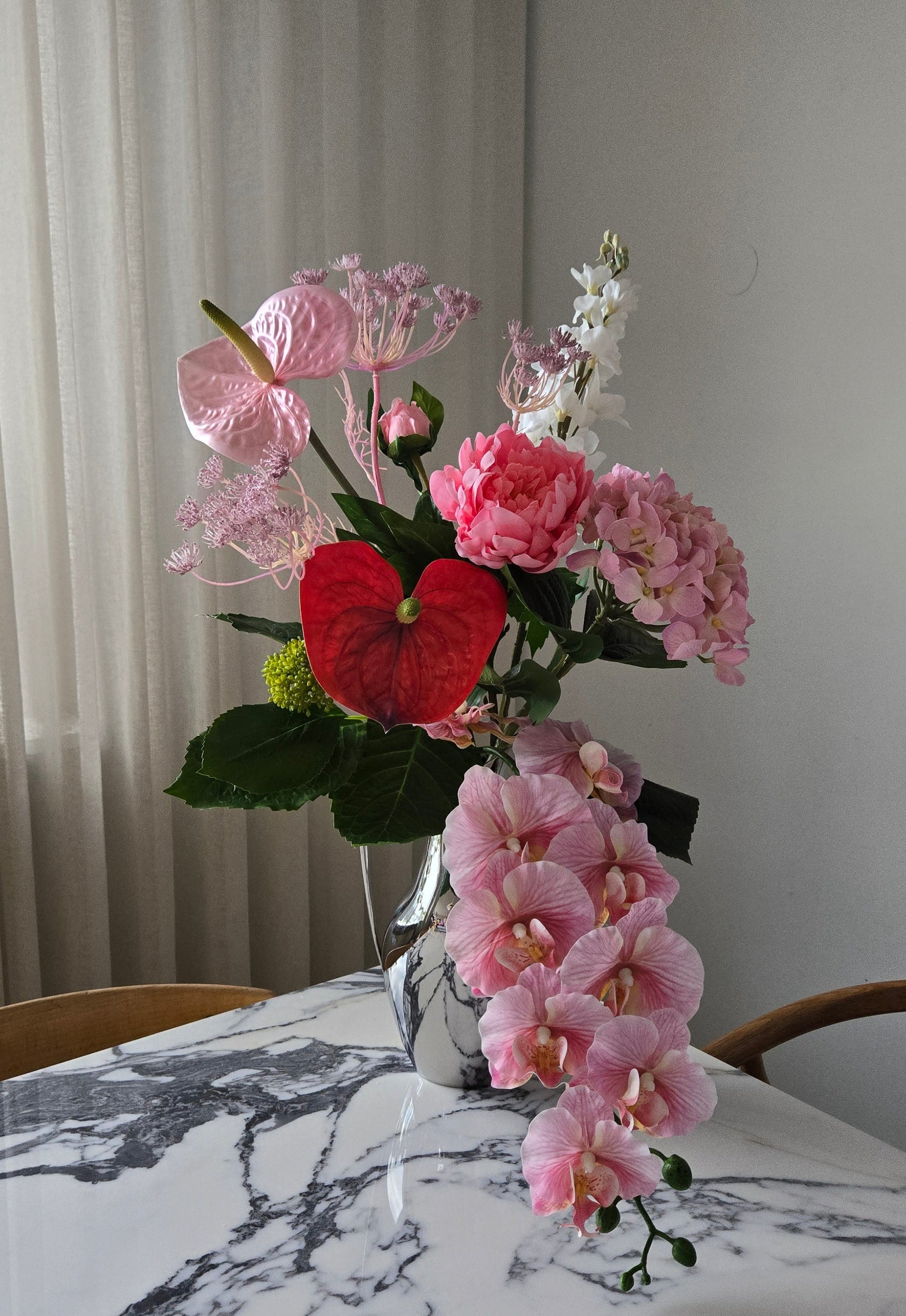 Hjartalag er vöndur fyrir þau rómantísku. Rauðar rósir víkja fyrir rauðum Flamingó blómum í bland við fallegu bleik blóm eins og Bóndarós og Orkideu.