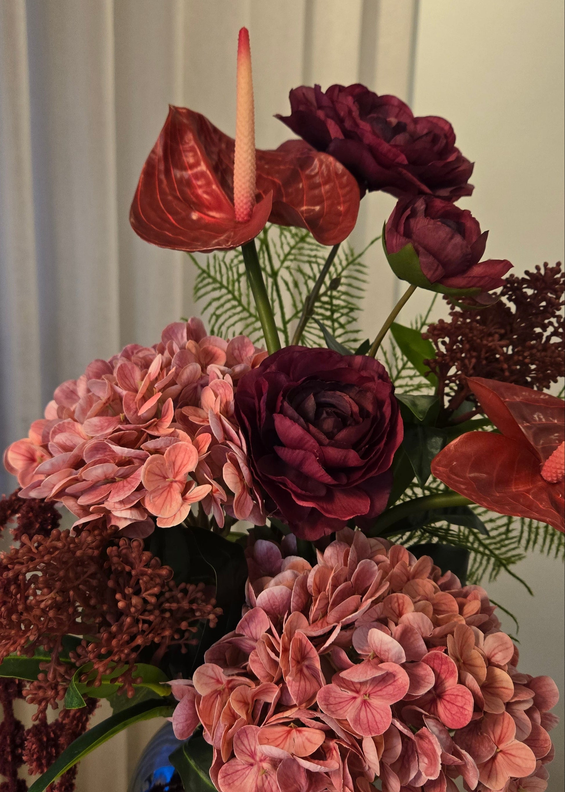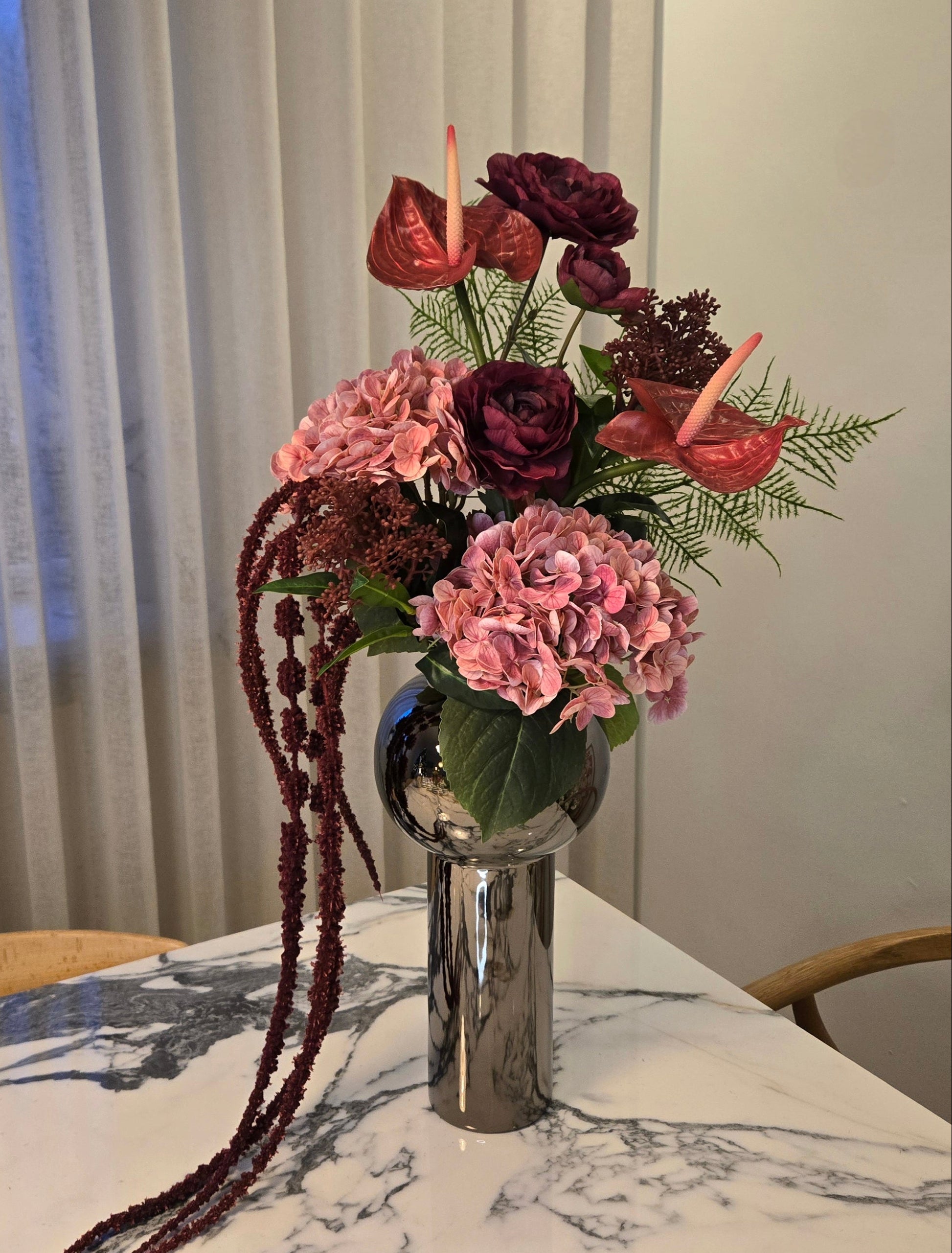 Hortensíur, Flamingó blóm, vínrauð Amaranthus o.fl. gera þennan vönd einstaklega glæsilegan.