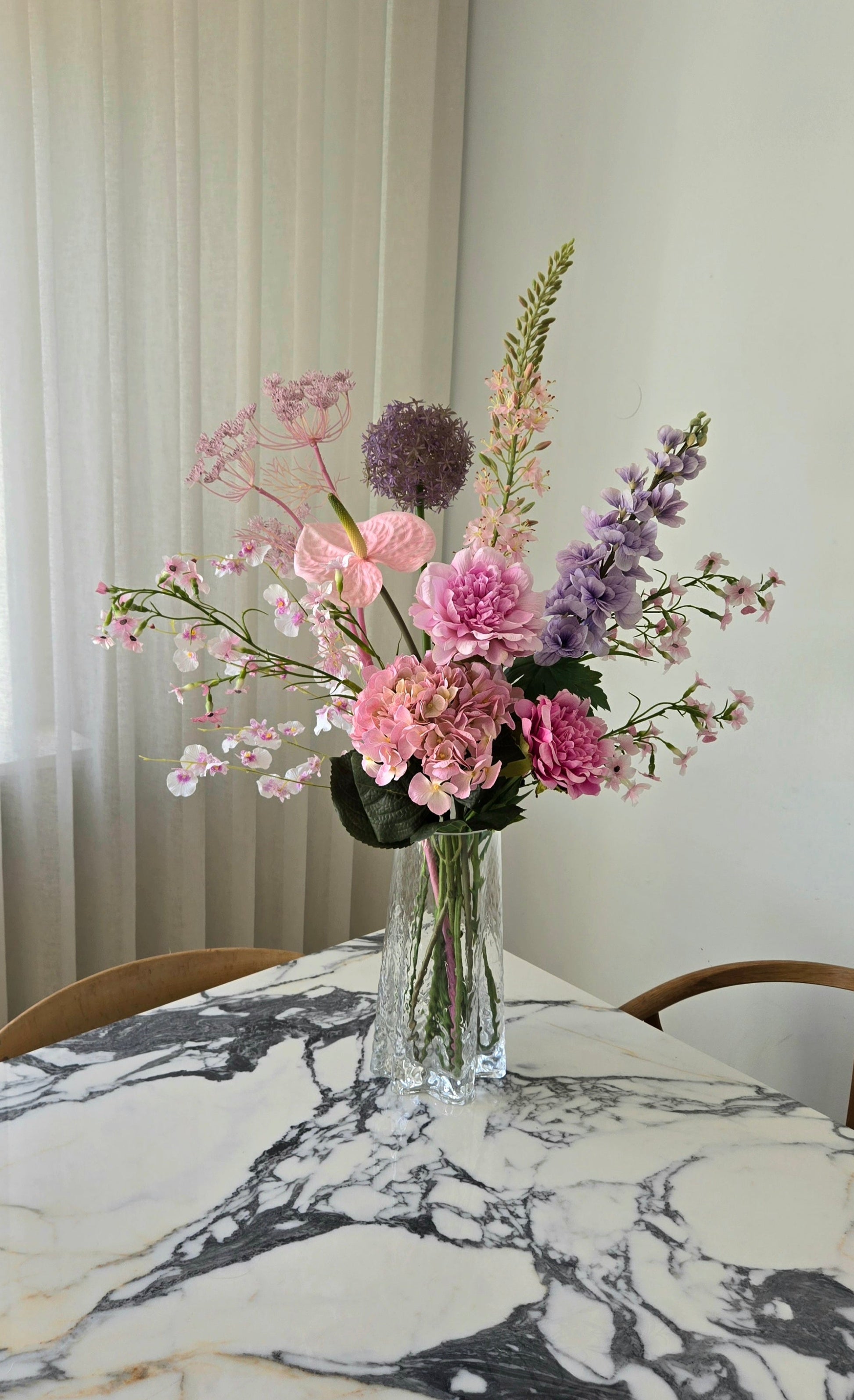 Þessi vorlegi og ljúfi, Spring Fling inniheldur 13 stilka. Bleik Hvönn, bleikur Riddaraspori, fjólublá Lúpína, rósir og fleiri falleg blóm mynda þennan dásamlega vönd.