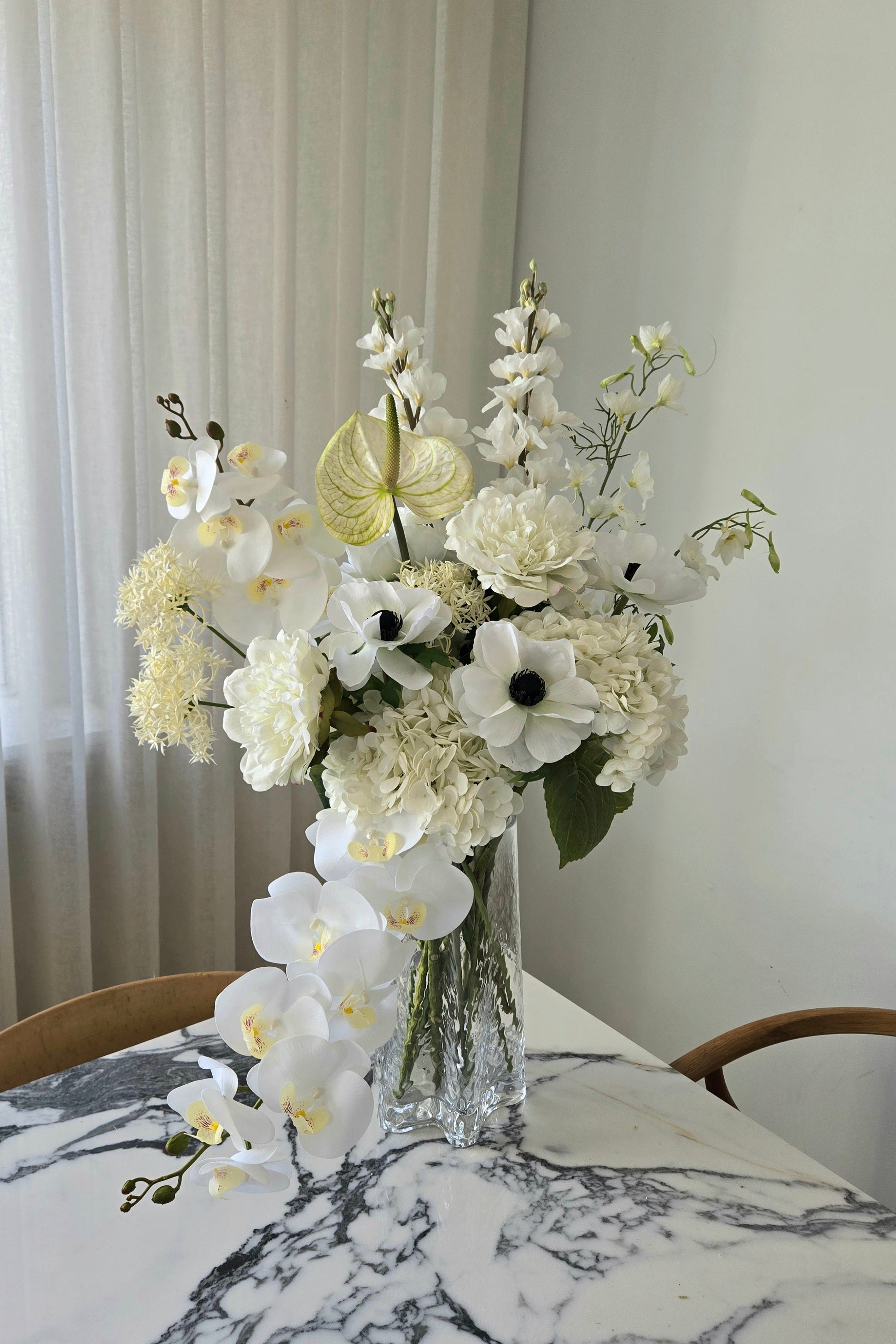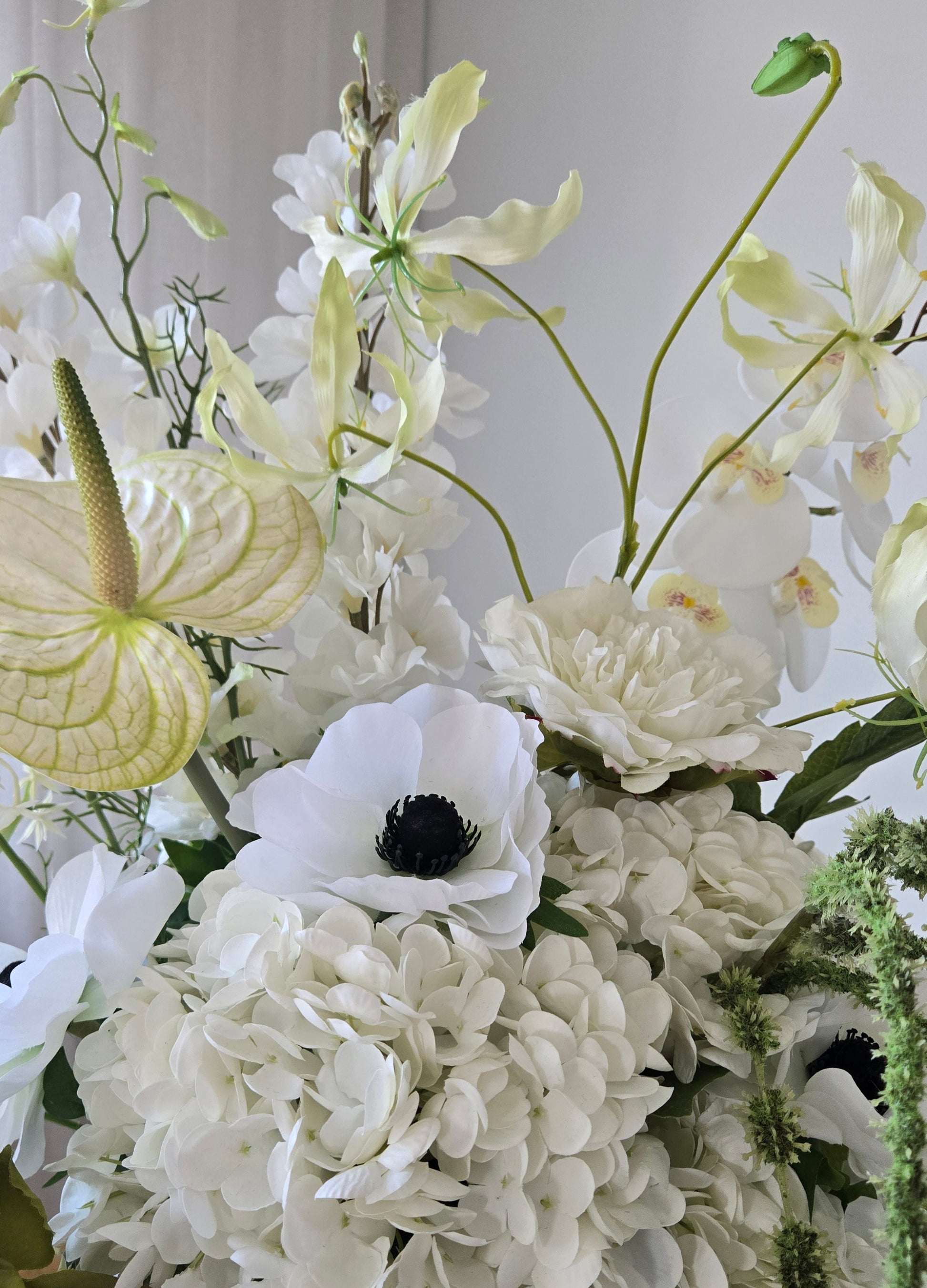 Stílhreinn hvítur vöndur sem inniheldur 16 stilka. 4x Hortensíur, hvítar rósir, Flamingó, Orkideur og fleiri falleg blóm.